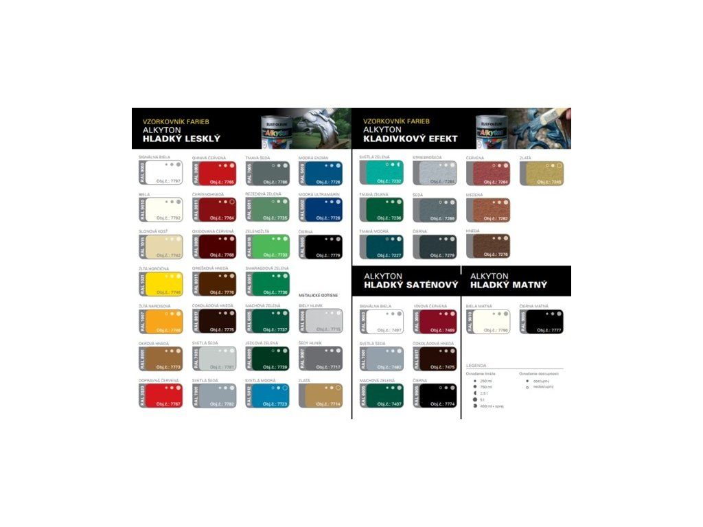 Antikorozivní přípravky Alkyton jsou samozákladové barvy v provedení RAL odstínů a kladívkovém provedení pro ošetřování různých povrchů a jejich ochraně proti korozi. Systém Antikorózní barva Alkyton zahrnuje i některé speciální materiály, jako například Galvinol, Primer a Penetrátor. Alkyton vstoupil na trh teprve nedávno, dokázal svoji konkurenci předběhnout a nabídnout něco víc. Antikorózní barva Alkyton je především určena k nátěrům nových ale i zkorodovaných železných kovů v exteriérech. Antikorózní barvu Alkyton lze aplikovat přímo na kov v prostředí s mírným průmyslovým znečištěním, nebo s použitím v systému se základovými nátěry na kovové konstrukce vystavené agresivnějšímu průmyslovému prostředí. Barva Alkyton kryje v 1vrstvě v celém spektru dodávaných odstínů. Účinné antikorozní pigmenty vytvářejí dlouhodobou antikorozní ochranu. Výrobek má velmi dobrou přilnavost i na zkorodovaný povrch po ručním očištění. Použitá rozpouštědla dodávají výrobku vynikající slévatelnost- při aplikaci štětcem lze dosáhnout vzhled obdobné kvality jako při stříkání. Modifikace alkydových pryskyřic uretany dodává výrobku dlouhodobou barevnou stálost a podstatně prodlužuje lesk. Rozdíly v hladkém a kladívkovém provedení. Hladké odstíny odpovídají vzorkovnici odstínů RAL. V tom je velká výhoda barev Alkyton mezi svými konkurenty. Barvu Alkyton v hladkém provedení lze aplikovat při teplotě od 5 °C do 25 °C. Nižší teploty mají vliv na dobu zasychání barvy, vyšší teploty naopak na kvalitu nátěru. Alkyton RAL 9006 a 9007 jsou stejně jako u ostatních výrobců jen přibližné odstíny (obsahují Aluminiový prach, který při natírání štětcem zvýrazní tahy štětcem různým směrem.) Jak na to? Je lepší nanést štětcem první vrstvu barvy, druhou vrstvu po zaschnutí nanést stříkací pistolí. Kladívkové efekty se používají na optické vyrovnání nerovností. Kolečka (oka) dělá silikonová složka, která je v barvě obsažena. Při nanášení barvy silikon částečně odpuzuje barvu díky odlišnému povrchovému napětí silikonu. Při nanášení barvy štětcem nemusí být všechna „oka“ stejná. Jak na to? Je možné nanést jednu vrstvu štětcem, druhou vrstvu stříkat vzduchovou pistolí. Větší ředění „kladívkové barvy“ způsobuje větší velikost „ok“ barvy. APLIKACE: Štětec, stříkání. VYDATNOST: 10,5 m2/l. DOBA SCHNUTÍ: Na prach 2 hodiny, přetíratelný po 16 hodinách. V případě, že toto zboží je momentálně vyprodané nebo je pouze na objednávku, bude u nás skladem do dvou pracovních dnů od naší objednávky. Nabídnul Vám někdo na tento výrobek lepší cenu? Nebo máte nějaký jiný dotaz k tomuto výrobku, neváhejte nás kontaktovat.Doplňkové parametry