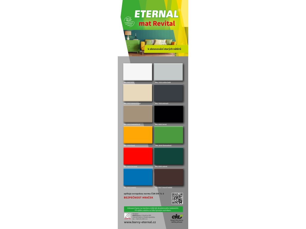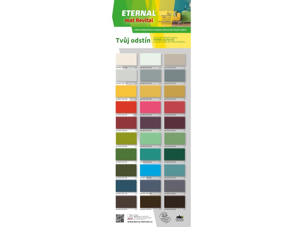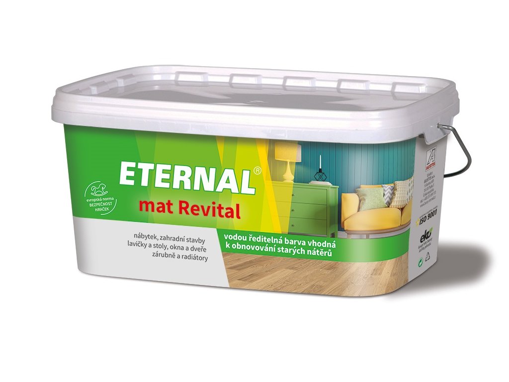 Eternal mat revital je určen k vnitřním i venkovním nátěrům dřeva, dřevovláknových a dřevotřískových desek, sádrokartonu, betonu a kovových podkladů opatřených antikorozním nátěrem, vláknocementových a třískocementových desek. Je vhodný pro nátěry okenních rámů a křidel, dveří, dveřních zarubni, těles ústředního topeni, nábytku, jako např. dřevěných i kovových židli, polic, laviček, klepadel na koberce apod. Eternal mat revital je vhodný pro nové i obnovovací nátěry. Není určen k nátěrům betonových podlah. Možnost tónovat.