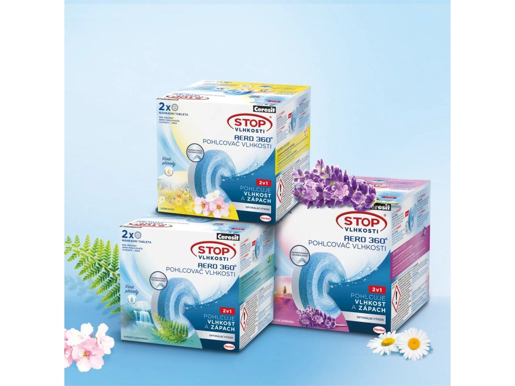 Nové tablety byly vyvinuté tak, aby jejich účinek pohlcování nadměrné vlhkosti byl vyšší až o 40% (po vložení do nového přístroje Ceresit Stop Vlhkosti AERO 360°). Díky členitému tvaru a proudění vzduchu okolo tablety jsou první absorpované kapky viditelné už po 12 hodinách. Tablety v přístroji se spotřebovávají postupně, zmenšují svůj objem. Vysrážená tekutina se soustřeďuje ve spodní části přístroje. Po spotřebování je potřebné vložit novou tabletu. Důležité je vkládat tabletu do nového přístroje AERO 360° po jeho otevření modrou stranou dolů.Náhradní tablety AERO 360° jsou nyní obohaceny i jemnou levandulovou a jarní vůní, která příjemně osvěží místnost. Kromě toho pohlcují nadměrnou vlhkost a optimalizují ji na správné hodnoty a zároveň neutralizují nežádoucí zápach až o 70%.