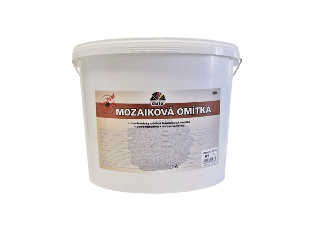 Düfa Mozaiková omítka MO jednoduše zpracovatelná, pro tvorbu vysoce odolných designových nebo ochranně-funkčních ploch – soklové partie, chodby, sloupy, atd. Popis produktu. Možnosti použití: Dekorační mozaiková kamínková omítka pro exteriérové i interiérové použití. Tvořena směsí barvených křemičitých písků v zrnitosti cca 1,6 mm. Pro plošné nebo místní dekorační a ochranné úpravy omítek. V exteriérech není vhodná na vodorovné plochy bez zajištěného odtoku vody. Vlastnosti: - vodou ředitelná - mechanicky velmi odolná - elastická - paropropustná - určena pro vnitřní i vnější použití Barevný odstín: viz vzorník Hustota: 1,84 g/cm3 Pigmentová báze: povrchově barvený křemičitý písek Pojivová báze: akrylátová disperze Obsah látek: akrylátová disperze, barvený křemičitý písek, voda, aditiva Upozornění: Materiál je tvořen směsí přírodních barvených písků – proto je nutné jednotlivé stavební celky provádět z jedné výrobní šarže, případně více šarží smíchat k dosažení rovnoměrného výsledného odstínu. Zpracování. Vhodný podklad: Podklad musí být čistý, nosný, suchý ( max. 4,5 obj.% vlhkosti ) a odmaštěný, zbavený biotického napadení a opatřený penetrací. Nerovnosti v podkladu zarovnat vnější stěrkovou hmotou. Určeno na vyzrálé omítky, beton či stěrkové hmoty, sádrokartonové desky, tvrzené vlákninové a azbestocementové desky. Vhodnost ostatních podkladů konzultujte s techniky naší firmy. Příprava podkladu: Před nanášením omítky musí být podklad ošetřen penetrací Komfort KOM4, nebo Unigrund P825, probarvenou do cca stejného barevného odstínu, jako aplikovaná omítka. Nesoudržné a silně savé podklady předem ošetřit hloubkovou penetrací, např. Komfort KOM 3, düfa D314 nebo D315. Způsob nanášení: nerezovým hladítkem Postup nanášení: Obsah kbelíku důkladně promíchat pomaloběžným míchadlem až ke dnu /nešlehat/. Ředění max. do 2% vodou. Nerezovým hladítkem produkt nejdříve nanést na podklad, pracovat přitom odspodu nahoru, až se dosáhne vrstvy o tloušťce velikosti zrna, tj cca 1,6-2 mm. Ihned, nebo nejpozději do 10 min. /podle teploty/ povrch opět nerezovým hladítkem vyhladit. Nezpracovávat na přímém slunci, za mlhy, deště, nebo silném větru. Jednotlivé stavební plochy (stěny, sokly, atd.) nutno zpracovat bez přerušení a napojování, do "živého" materiálu. Mléčný zákal mizí se zasycháním materiálu. V případě dlouhodobého provlhnutí se může tento zákal znovu objevit i v pozdější době. Teplota při zpracování: min. +5°C teplota objektu i okolního vzduchu, během zpracování i schnutí. Nezpracovávat na přímém slunci. Doba schnutí odolnost proti dešti: cca po 24 hod. při +20°C a 60% rel. vlhkosti vzduchu*: vyzvrzené po: 1 - 3 dnech *Při nižších teplotách nebo vyšší vlhkosti vzduchu se doba schnutí výrazně prodlužuje. Spotřeba*: cca 4,0 – 4,5 kg/m2 *Spotřeba je závislá na vlastnostech podkladu a způsobu nanášení. Pro přesnou kalkulaci doporučujeme provést zkušební nátěr. Ředění: vodou Čištění nástrojů: ihned po použití vodou, během pracovních přestávek nechat ponořené ve vodě. Balení: 25,00 kgDoplňkové parametry