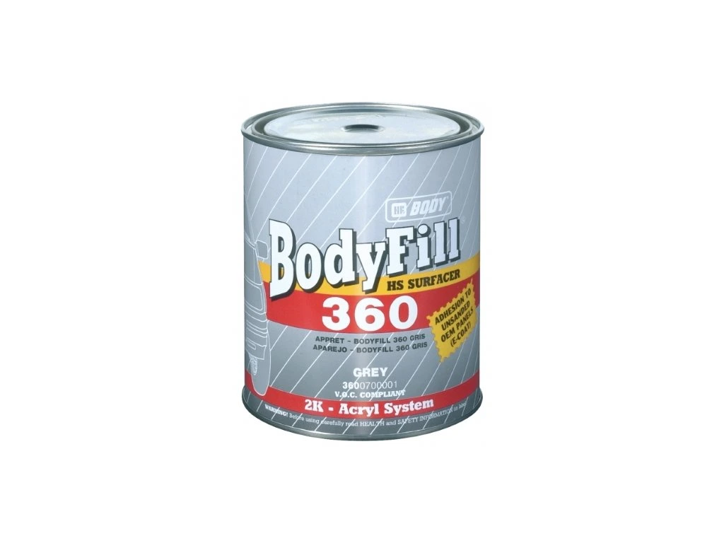 Bodyfill 360 je vhodný zejména na nové neobroušené originální náhradní díly (O.E.M. / E-COAT). Plnič můžeme aplikovat dvěma způsoby, a to standartně (po zaschnutí brousit brusným papírem) nebo přímo „mokré do mokrého“. Má vynikající přilnavost na neobroušené povrchy. Je vhodný rovněž na plastové povrchy. Dobrá slévatelnost a vyrovnávací vlastnosti jsou zárukou kvalitního výsledku. Tuží se v poměru 2:1 tužidlem BODY 720 NORMAL / BODY H725. Použitím urychlovače HB BODY PRO A715 TURBO AX se doba schnutí výrazně zkracuje. Ředí se pouze v případě aplikace „mokré do mokrého“ max. 20% akrylátovým ředidlem.Balení : 400ml sprej, 1lt, 4lt Odstín : bílý, šedý, žlutý, červený, černý, modrý, zelený