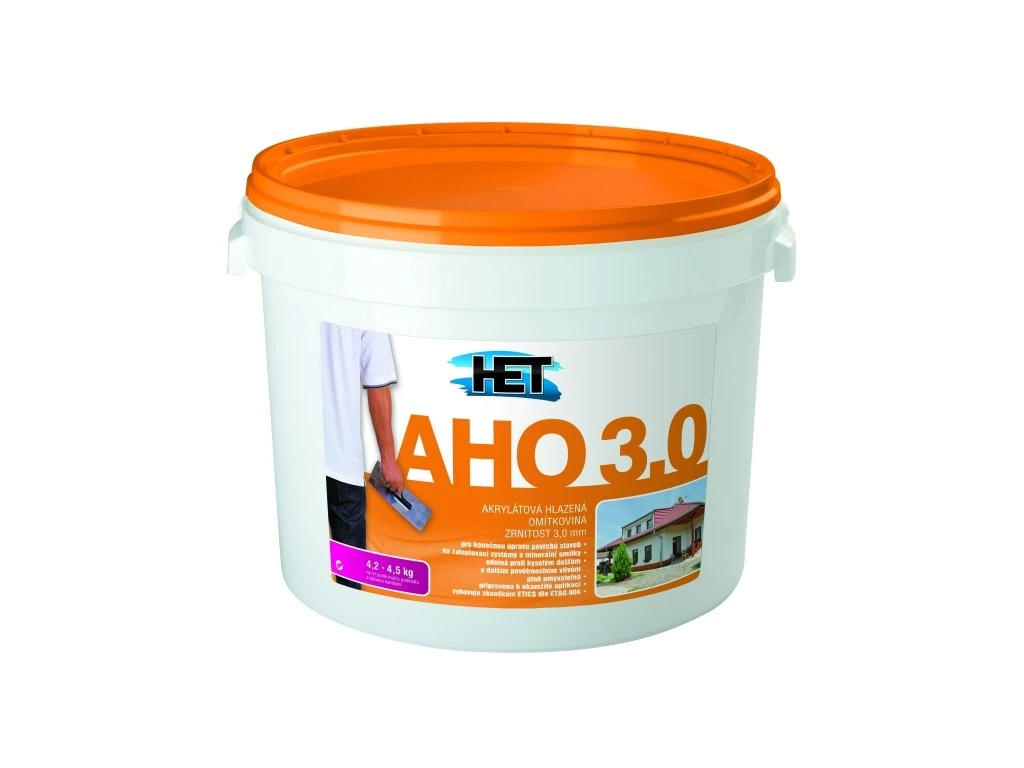 Het AHO akrylátová hlazená omítka dostupná v zrnitosti 1,00 mm, 1,5 mm, 2 mm, 3 mm. omítkovina je určena pro konečnou úpravu povrchů staveb, zejména kontaktních zateplovacích systémů (ETICS). Je vhodná i na hladké minerální omítky, betonové panely a monolity. Je rovněž součástí ETICS HET. Omítkovina je dodávána v pastovitém stavu, připravená pro přímé použití, snadno se zpracovává, má výbornou adhezi a vytváří rovnoměrně strukturovaný povrch. Omítka je plně omyvatelná, velmi dobře čistitelná a odolná povětrnostním vlivům. Omítkovina není vhodná pro objekty s nadměrnou či stálou vlhkostí - vzlínající vlhkost ve zdivu, dlouhodobá expozice sněhem, nesvislé venkovní plochy apod. Syté odstíny je vhodné sjednotit přetřením omítky egalizačním nátěrem natónovanou fasádní barvou, např. MIKRAL SILIKON nebo MIKRAL RENOVO. Po natónování je nutné omítkoviny co nejdříve (cca do týdne) zpracovat, případně je potřeba na povrch omítkoviny v obalu rozprášit cca 20 ml pitné vody, což eliminuje zasychání na povrchu hmoty v obalu. Přednosti: - pro konečnou úpravu povrchů staveb - určena na zateplovací systémy a minerální omítky - odolnost proti kyselým dešťům a dalším povětrnostním vlivům - okamžitá aplikace - omyvatelnost - vyhovuje zkouškám ETICS dle ETAG 004 Podkladový materiál: omítky, betonové panely, vápenocementové omítky, omítky zateplovacích systémů. Odstín: nestandardní bílý, tónování se provádí pomocí tónovacích strojů tónovacími systémy HET. Při použití na ETICS, především na sluncem exponované velké plochy, je povoleno používat pouze odstíny s koeficientem odrazivosti (HBW, Y) ? 30. Uvedená cena u tohoto produktu nezahrnuje pigment v případě tónovaní na míchacím zařízení. Konečná cena je závislá na množství barevného pigmentu, který bude k této bázi přidán. Spotřeba: podle kvality podkladu (nasákavost, rovinnost, apod.) a strukturování. zrnitost hladítkem stříkáním tryska AHO 1,0 2,0 kg.m-2 1,4 kg.m-2 6 mm AHO 1,5 2,4 kg.m-2 2,0 kg.m-2 6 mm AHO 2,0 3,3 kg.m-2 3,0 kg.m-2 8 mm AHO 3,0 4,5 kg.m-2 4,2 kg.m-2 10 mm Použití: pro konečnou úpravu povrchů staveb zejména kontaktních zateplovacích systémů a na minerální omítky omítkovina je součástí certifikovaných zateplovacích systémů HET Doba zasychání: min. 24 h při 20 °C a 60 % relativní vlhkosti vzduchu Skladování: 24 měsíců od data výroby v původním neotevřeném obalu při teplotě +5 až +30°C, nesmí zmrznout, chránit před přímým slunečním zářením. Možnosti aplikace: nerezový natahovák Balení: 12 kg, 25 kgDoplňkové parametry