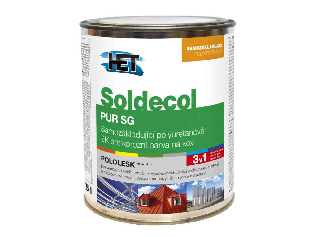 Het Báze Soldecol PUR SGdvousložková polyuretanová barva pro venkovní i vnitřní nátěry železných a neželezných kovů (pozink, měď, hliník apod.). Je určena zejména k nátěrům ocelových konstrukcí, zemědělské, manipulační, dopravní a skladové techniky, klempířských prvků, stožárů, střešních plechů, přepravních a skladových kontejnerů apod.