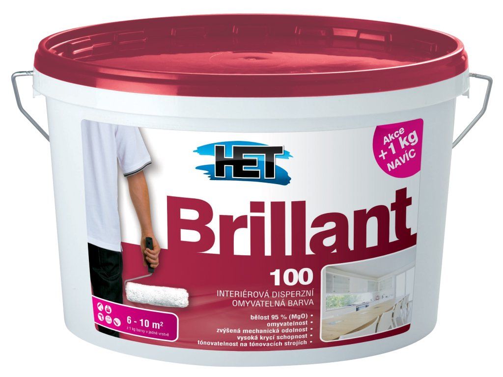 Het Brillant 100 bílá použití:k vnitřním nátěrům stěn a stropů, vápenných, vápenocementových, sádrovápenných a sádrových omítek, sádrokartonových, sádrovláknitých a dřevovláknitých desek, omítek s akrylátovým pojivem, betonových panelů a monolitů, papírových tapet k tomu určených, tapet ze skelných vláken apod. Rovněž k aplikaci na podklady s kombinací např. minerálních omítek a sádrokartonu nebo po vhodné úpravě povrchu na sololit, umakart aj.