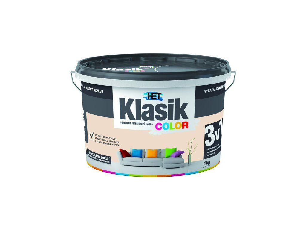 Het Klasik COLOR je kavlitní tónovaná disperzní barva, vhodná pro obývací a komerční prostory, dětské pokoje, jídelny, chodby, kanceláře, prodejní prostory.