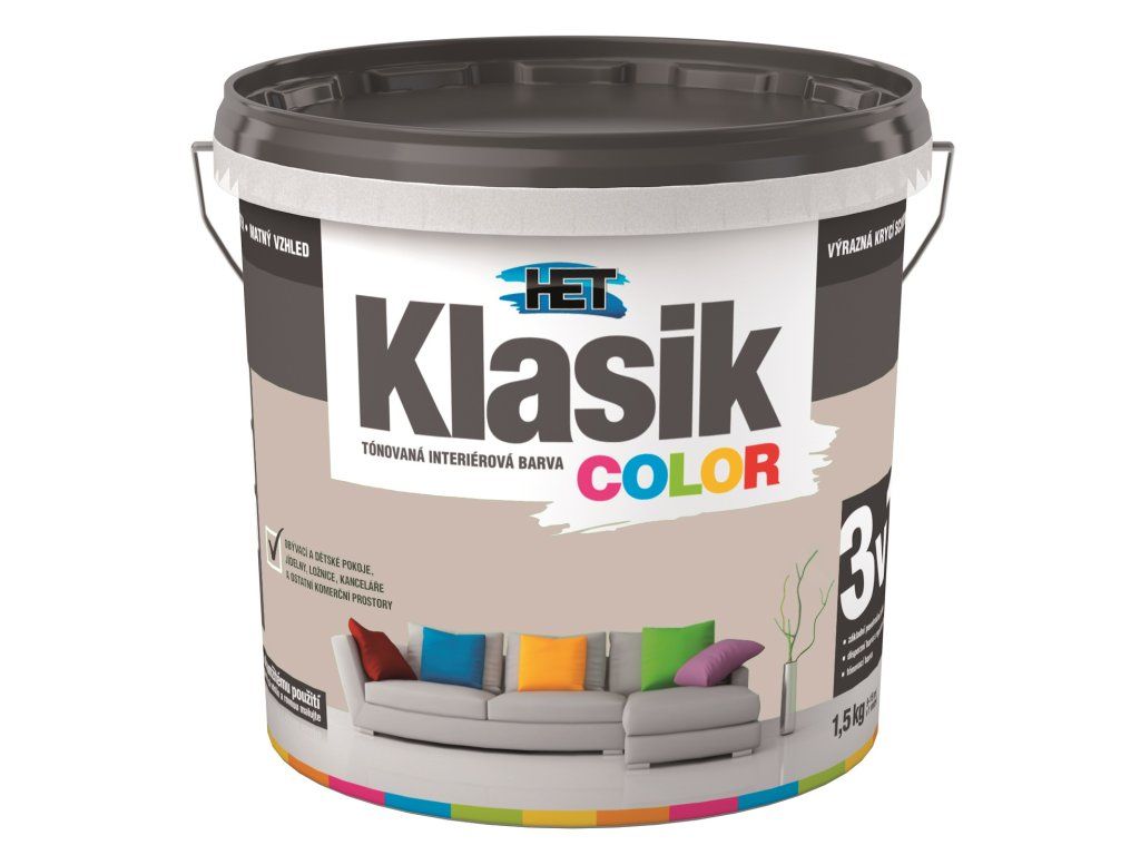 Het Klasik COLOR je kavlitní tónovaná disperzní barva, vhodná pro obývací a komerční prostory, dětské pokoje, jídelny, chodby, kanceláře, prodejní prostory.