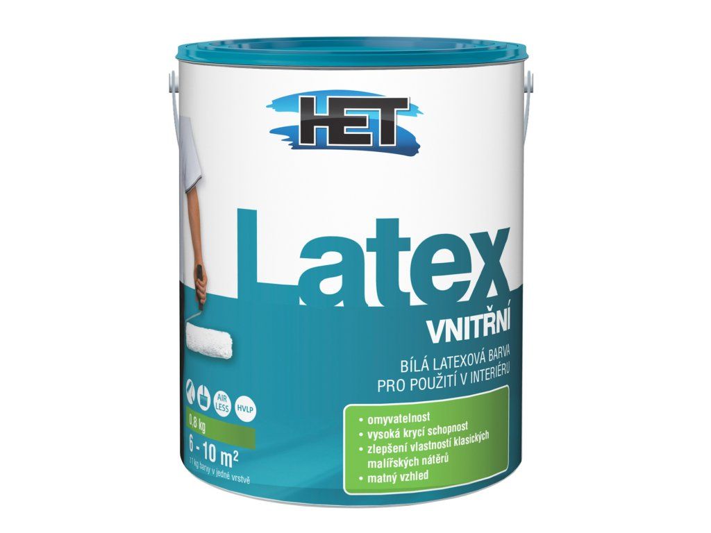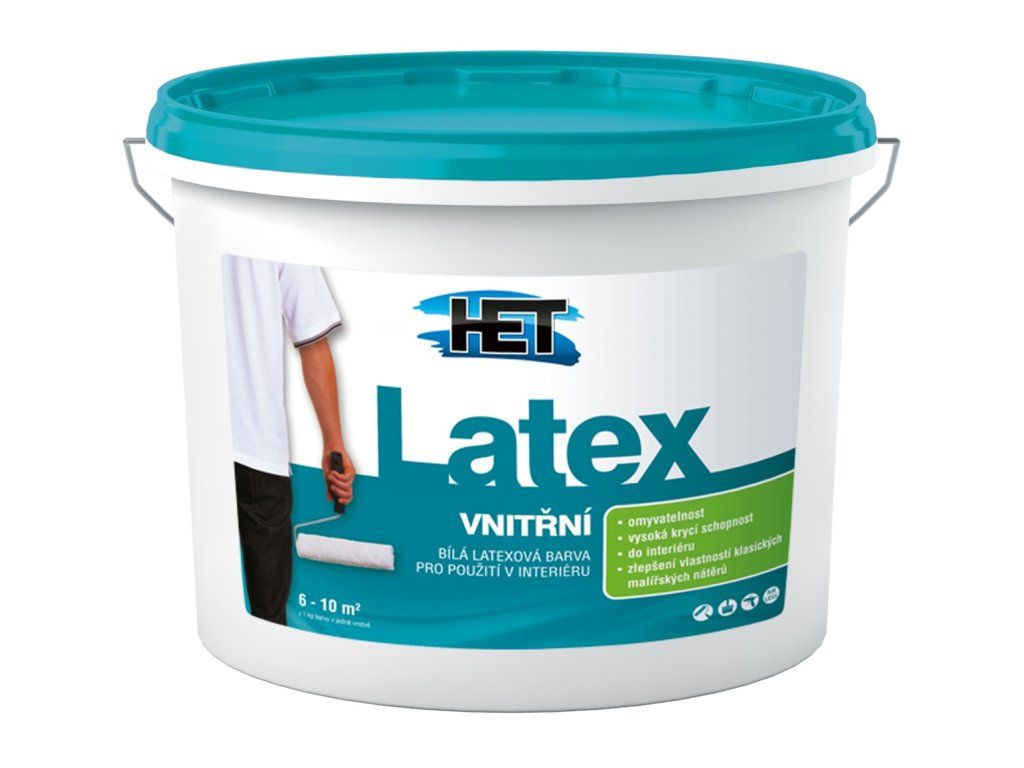 Het Latex vnitřní použití:K vnitřním nátěrům stěn a stropů, vápenných, vápenocementových, sádrovápenných a sádrových omítek, sádrokartonových, sádrovláknitých a dřevovláknitých desek, omítek s akrylátovým pojivem, betonových panelů a monolitů, papírových tapet k tomu určených, tapet ze skelných vláken apod.