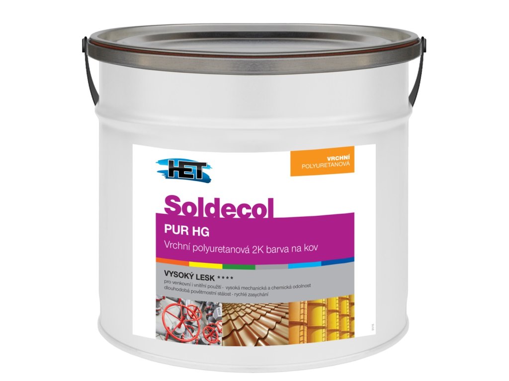 Het Soldecol PUR HGdvousložkový polyuretanový email pro venkovní i vnitřní nátěry železných a neželezných kovů (pozink, měď, hliník apod.). V případě ocelových a litinových povrchů se kombinuje s vhodnou protikorozní barvou.