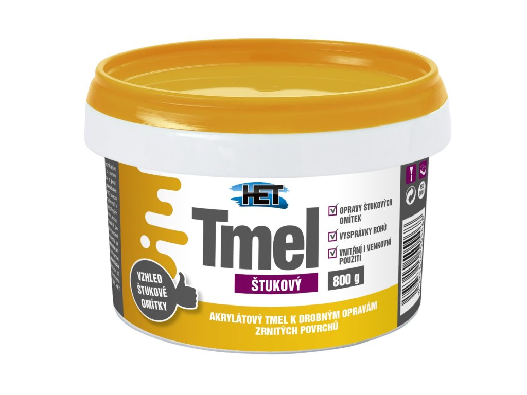 Het Tmel štukovýjednosložkový přetíratelný speciální tmel na bázi akrylátu vytvářející povrch se zrnitou strukturou napodobující štukovou omítku.