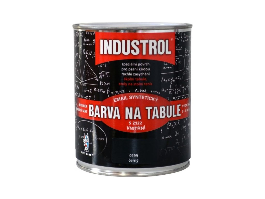Industrol S 2122 barva na tabule, tato barva je určena především na nátěry školních tabulí (odstín 0199 - černá a 0570 - zelená). Lze použít i k nátěrům oceli, dřeva, dřevovláknitých desek apod. materiálů pouze pro vnitřní prostředí.Psaní křídou na školní tabule je možné provádět po dokonalém protvrdnutí nátěru, ne dříve než po 5 dnech. Barva není určena pro nátěry vystavené účinkům povětrnosti a k nátěrům přicházejícím do přímého styku s potravinami, krmivy, pitnou vodou a pro nátěry dětského nábytku a hraček.