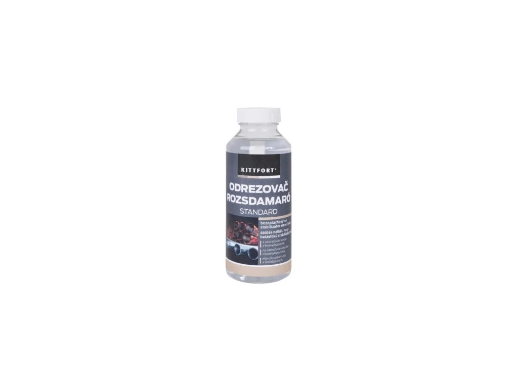 Kittfort Odrezovač Standardodrezovač se nanáší nátěrem, nástřikem nebo ponorem. Při silnějším zkorodování je třeba nátěr odrezovačem 2x až 3x opakovat. Při použití ponoru je doba aplikace 10 min. (Působení odrezovače se projeví vznikem modročerného zbarvení na povrchu předmětu).