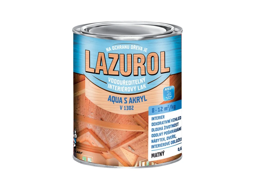 Lazurol Aqua S akryl V1302 Používá se k provádění nátěrů tvrdého i měkkého dřeva, nábytkových dílů, dřevěných obkladů, překližky apod. v interiéru. Je možno jej použít i jako vrchní lesklý nebo matný nátěr na disperzní barvy.