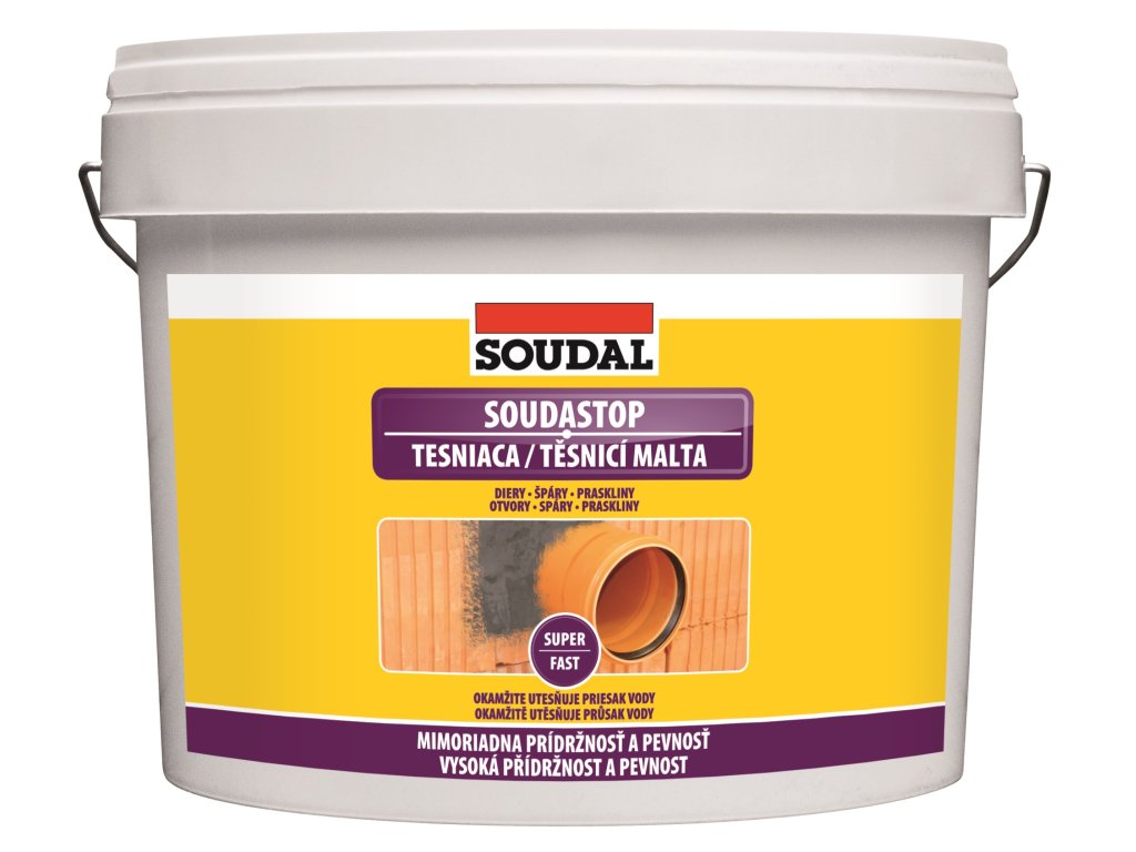 Soudal Soudastop Těsnicí maltamá vynikající přilnavost k většině stavebních pokladů, umožňuje okamžité utěsnění, velmi rychle tvrdne i pod vodou, k použití v interiéru i exteriéru, nehořlavá.