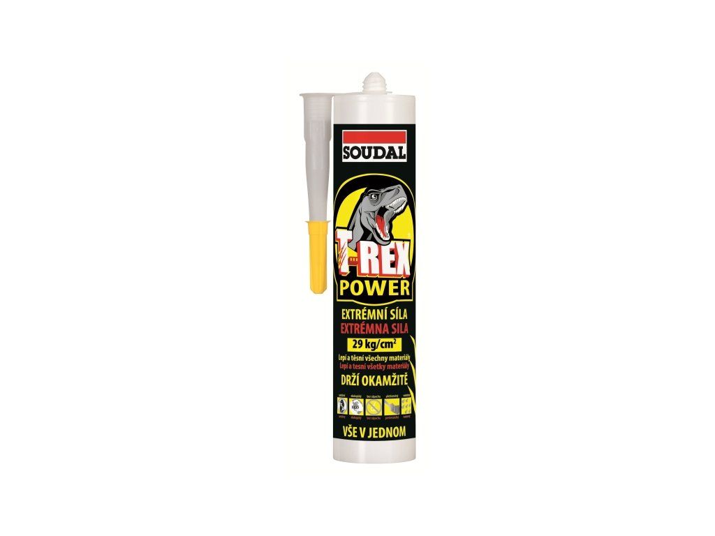 Soudal T-REX Power jako silikon je stejně odolný proti UV záření a stejně pružný, jako akrylátový tmel je přetíratelný většinou nátěrů a jako polyuretanový tmel má silné lepicí účinky.Je vhodný pro vnitřní i venkovní použití a má výbornou přilnavost k většině stavebních materiálů. Neobsahuje rozpouštědla, kyseliny ani izokyanáty. Neztrácí své vlastnosti ani v prostředí se zvýšenou vlhkostí, je vhodný pro sanitární účely. Vysoká počáteční přilnavost T-REX předurčuje pro přímé lepení bez nutnosti fixace.